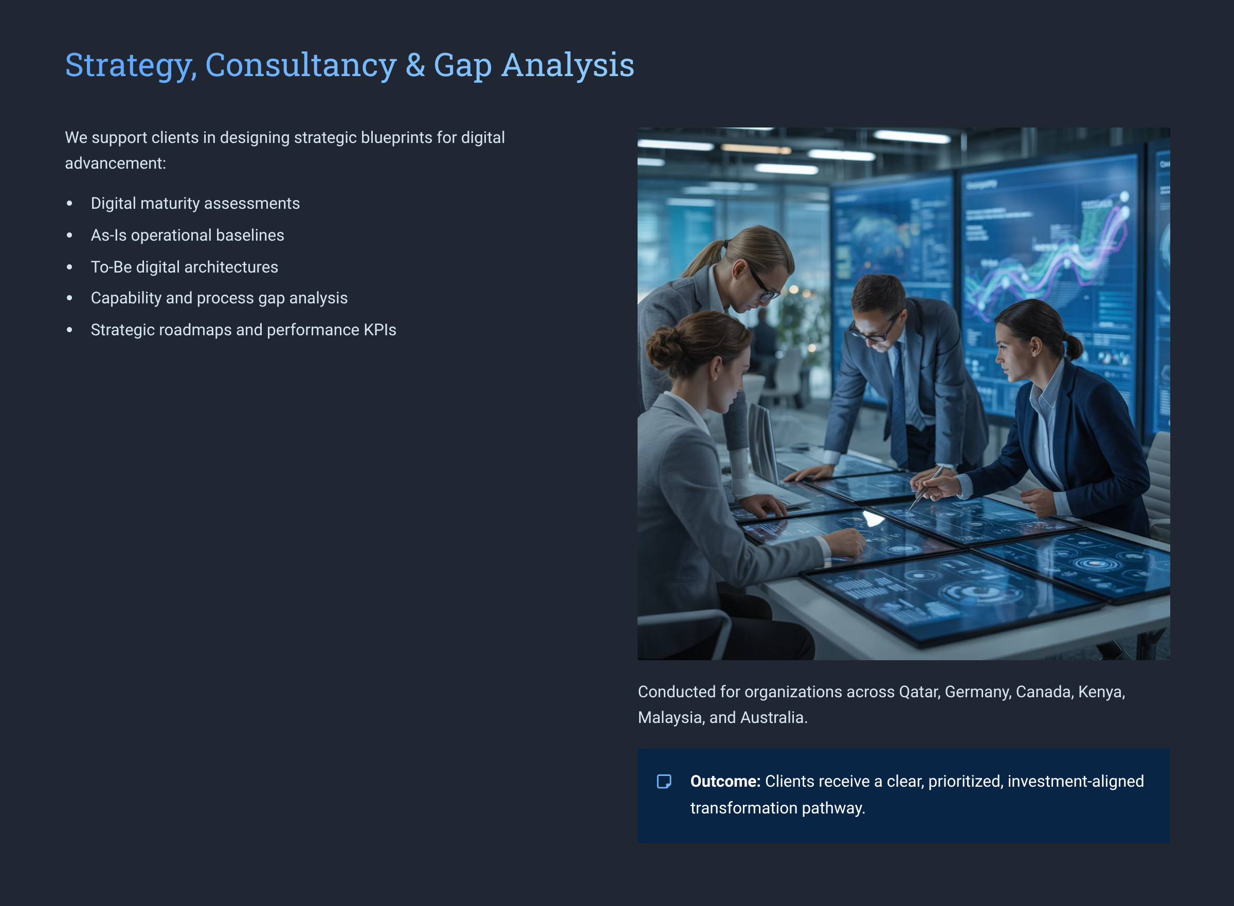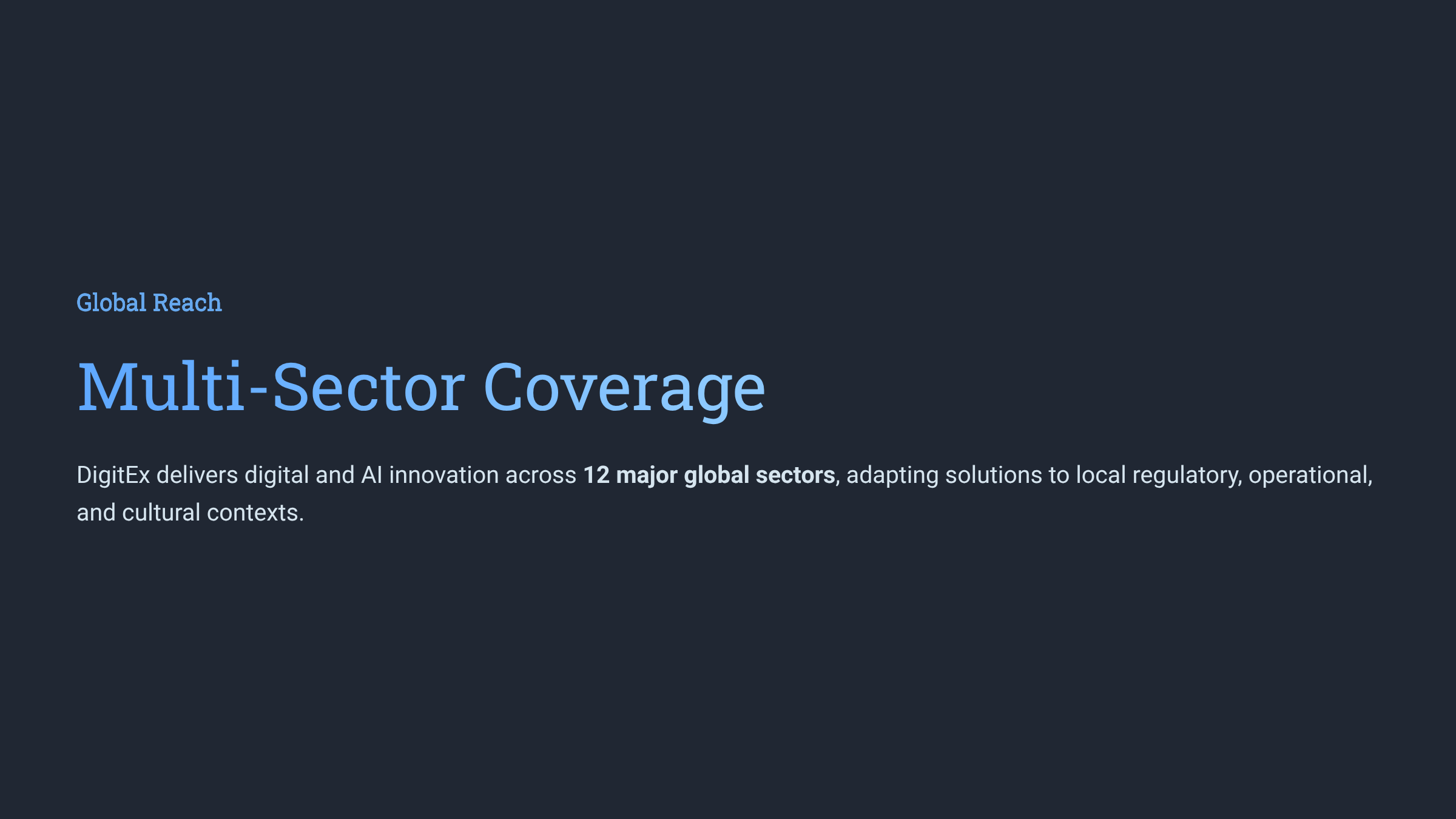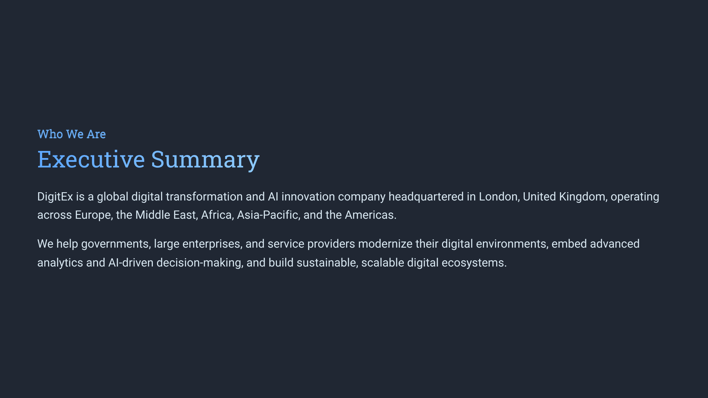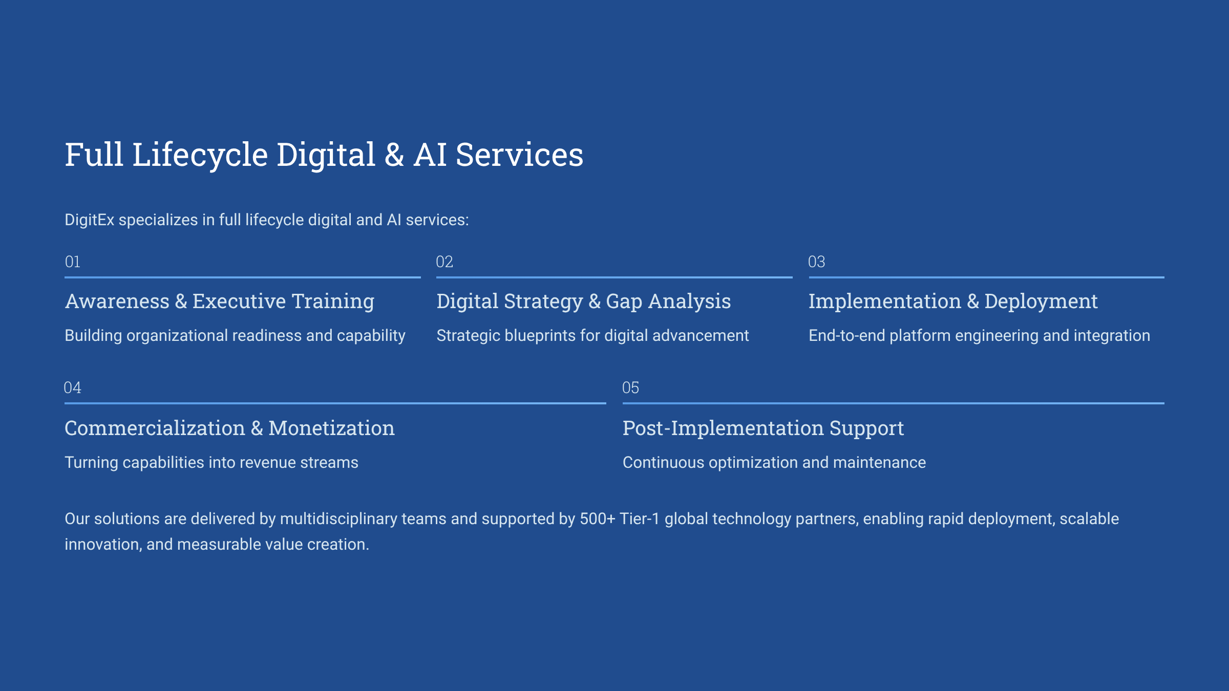 DigitEx together with its strategic and primary partner, SMM Trading Services (SMMTS), are multidisciplinary groups of professionals active in a variety of vertical industries including Telecom, IT, Fintech, ML & AI, Connected Vehicles, Smart Cities, Augmented and Virtual Reality (AR/VR), etc. providing diverse services ranging from research and consulting to execution and training.