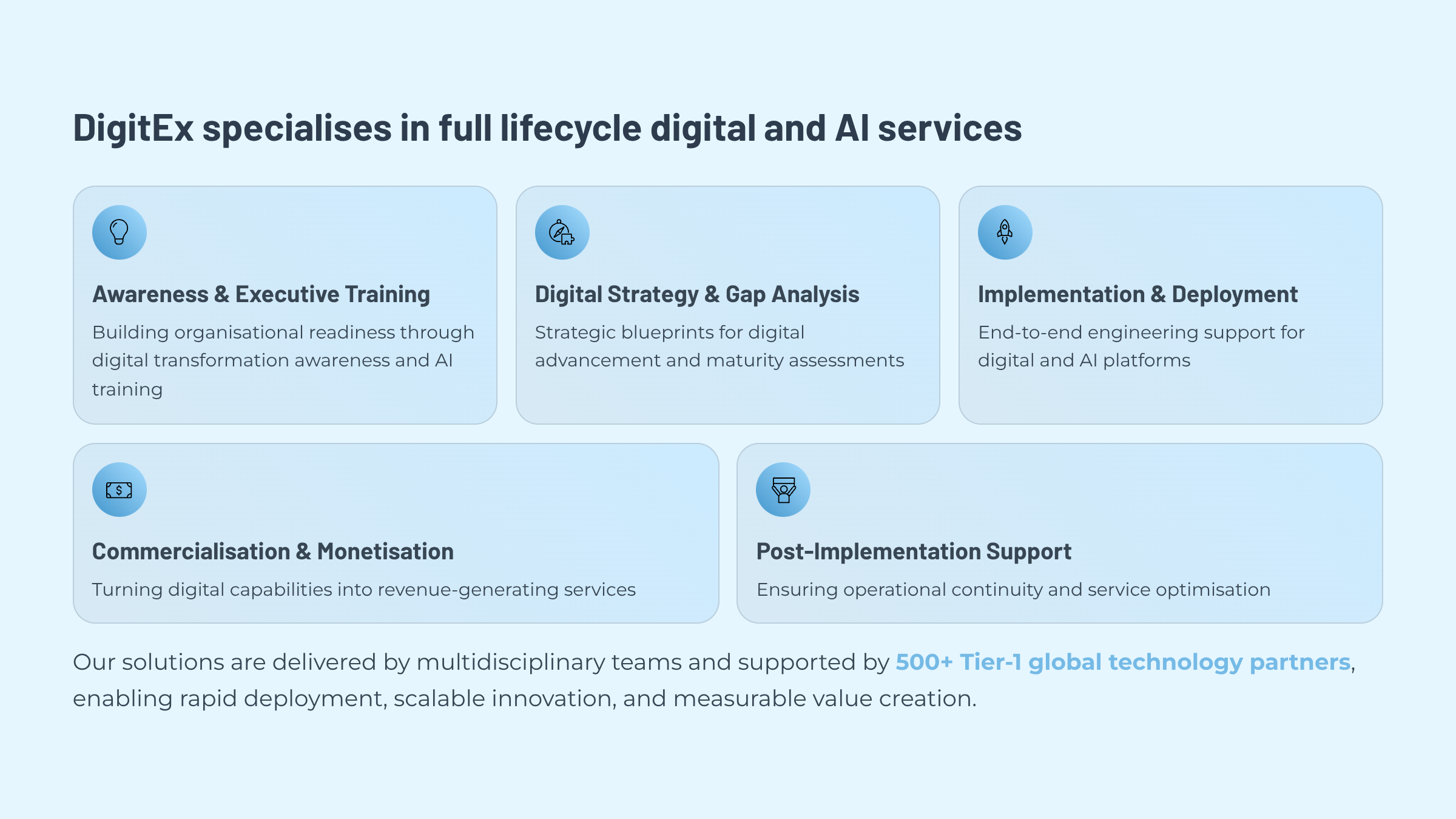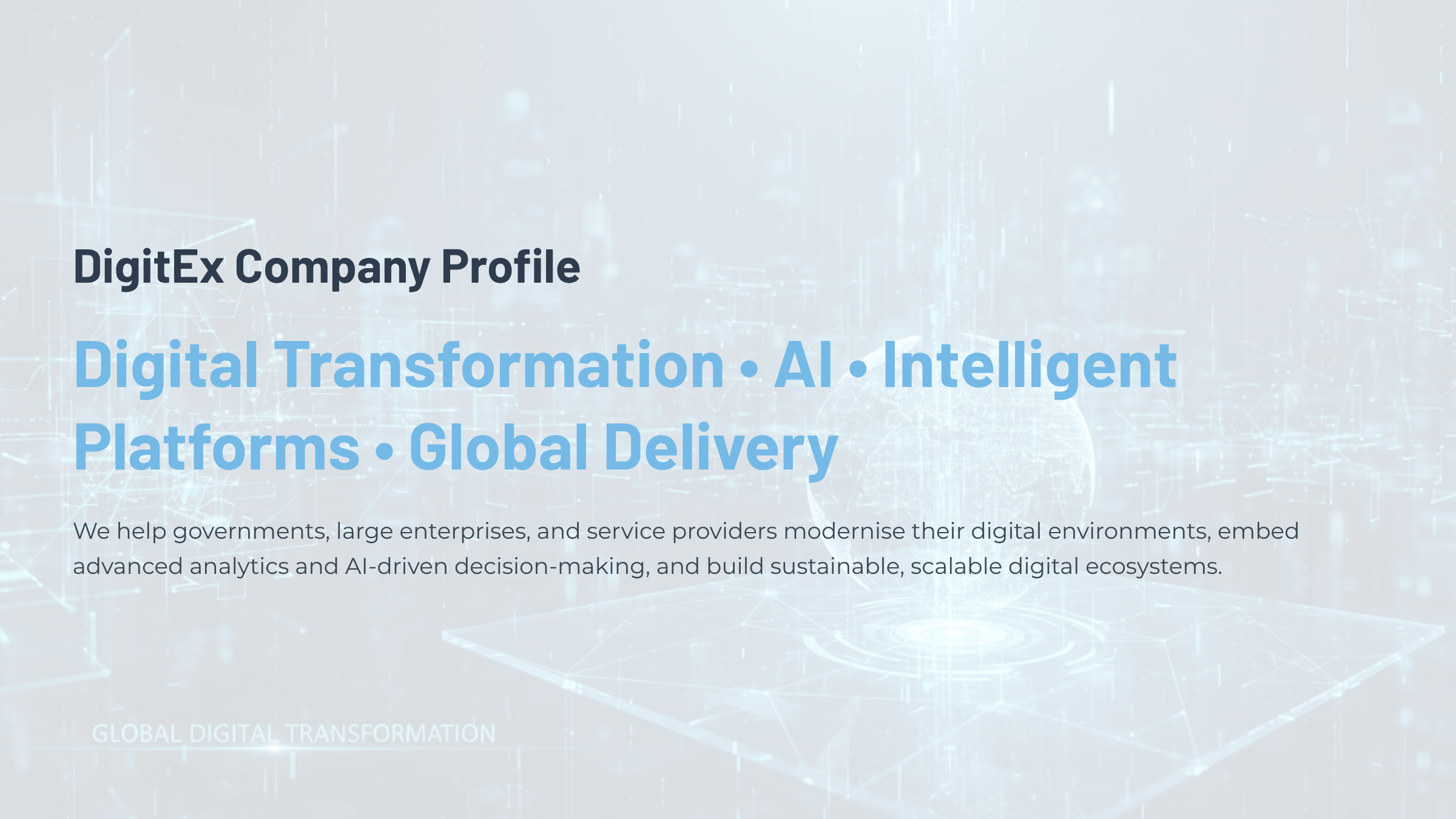 With extensive industry experience, DigitEx’s team works closely with tier-1 vertical industries, hardware/software vendors, and regulatory authorities across different industry sectors. DigitEx is committed to providing digital and AI-enabled solutions and growth opportunities in forward-thinking sectors.